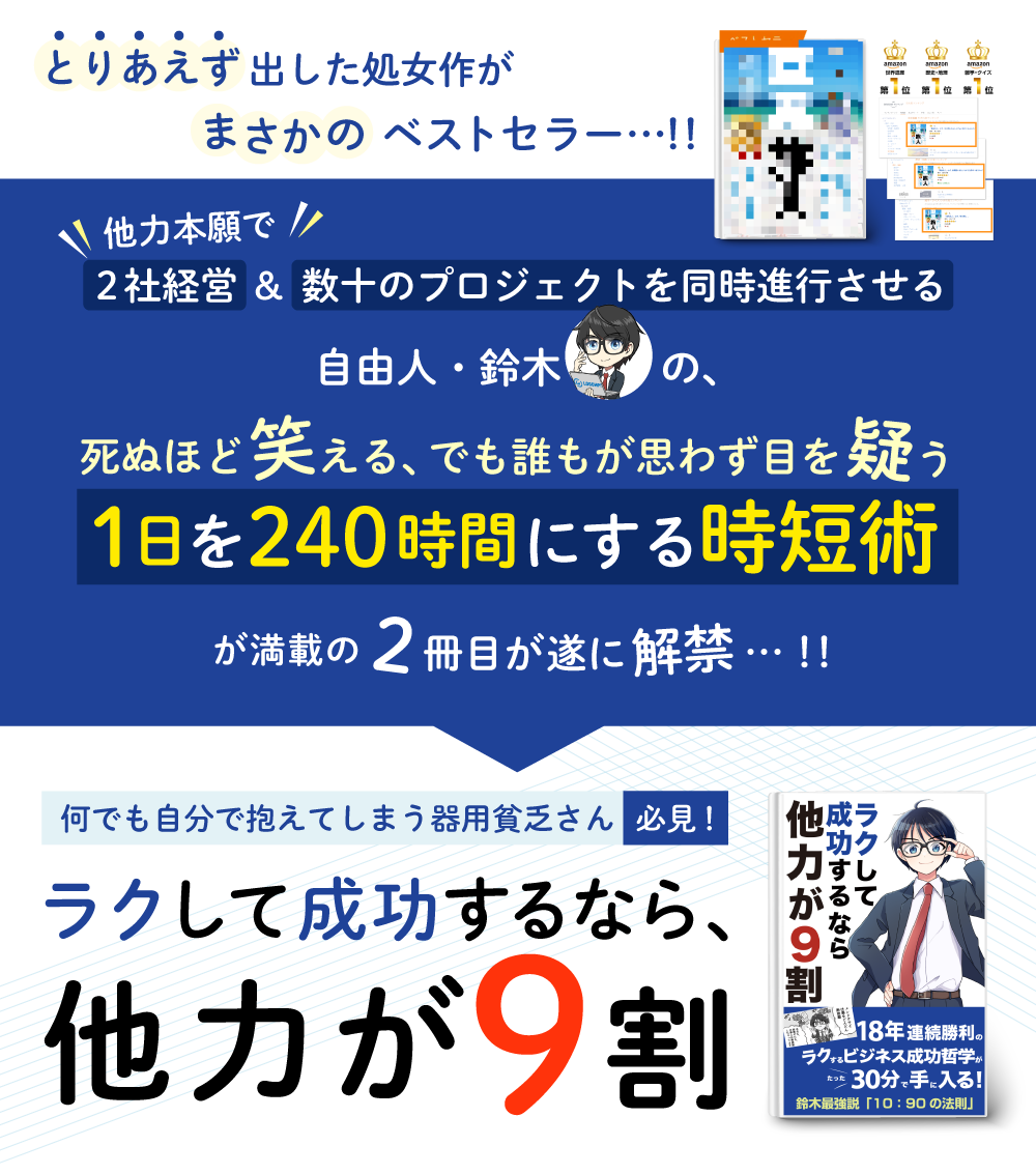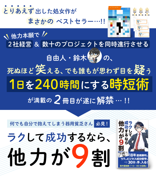 実名でとりあえず出してみた1作目の書籍がいきなりベストセラーに。「他力が9割」というモットー通り、自身はほぼ働くことなく外注で完結する会社を2社経営する自由人オーナーである。